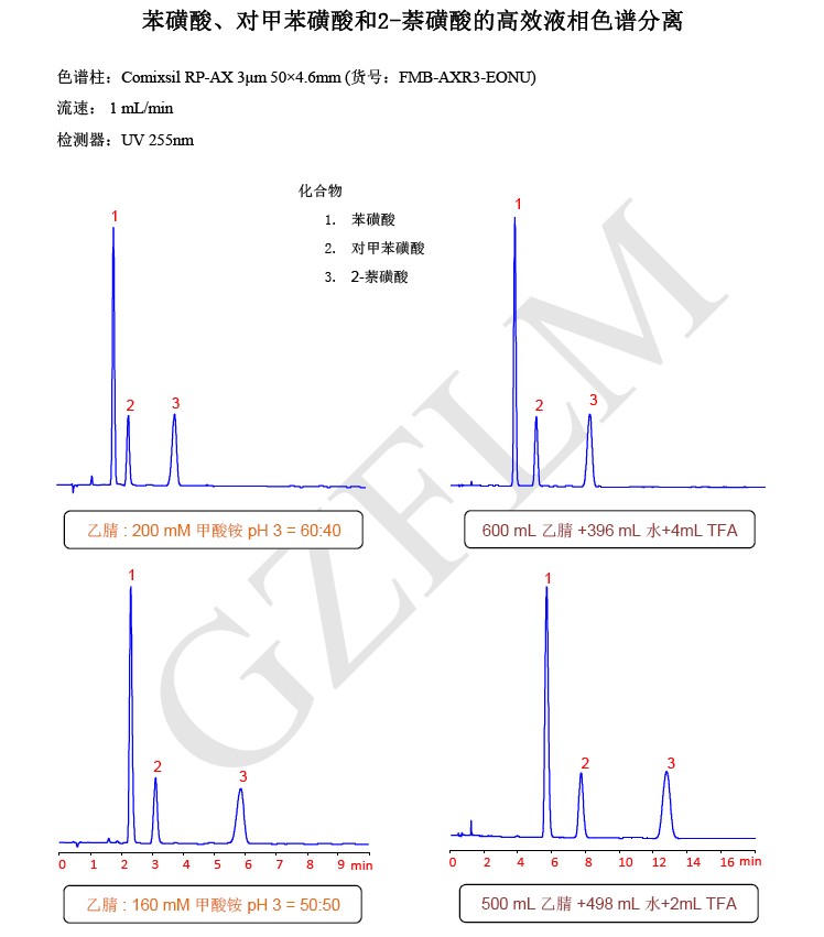 從上圖能看出,當(dāng)流動相加入的緩沖鹽的濃度越大或者加入酸的濃度越大時,會增加Comix柱子的洗脫能力。