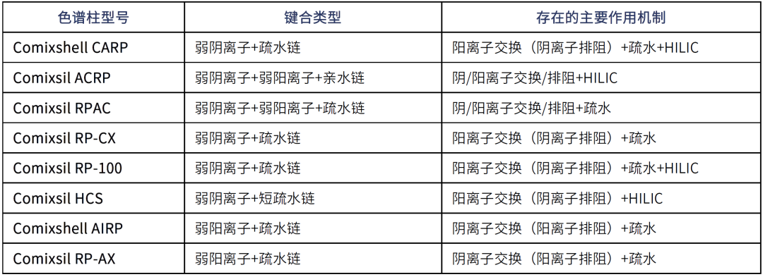 2021年,我們在混合作用(mixed-mode)固定相設(shè)計(jì)上繼續(xù)開疆拓土,開發(fā)出了Comixsep系列的三款多種作用力組合的反相固定相;