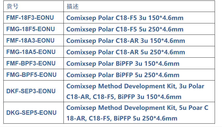 它們在疏水作用的基礎(chǔ)上增加了很強(qiáng)的氫鍵、π-π、偶極-偶極等作用,使色譜柱具有了和一切現(xiàn)有常規(guī)C18等反相柱不同的選擇性,極大地增加了解決復(fù)雜分析問題的成功率。同時(shí),Comixsep系列色譜柱的操作和常規(guī)C18一樣,無需特別的沖洗、平衡和保存條件,使用非常友好。