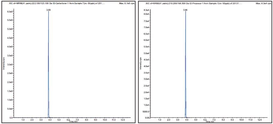 圖 4 克百威(Carbofuran)(222.1/123.1)質譜圖 圖 5 殘殺威(Propoxur)(210.2/186.3)質譜圖